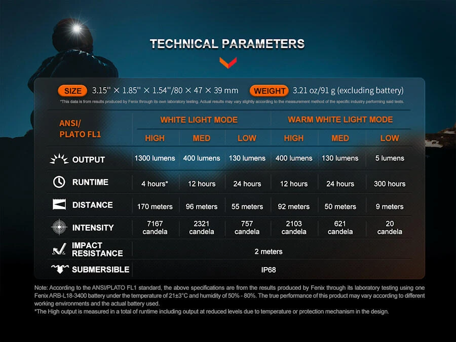 - High 1300 lumens (4 hrs total inc temperature and battery level step downs) – 170m beam
