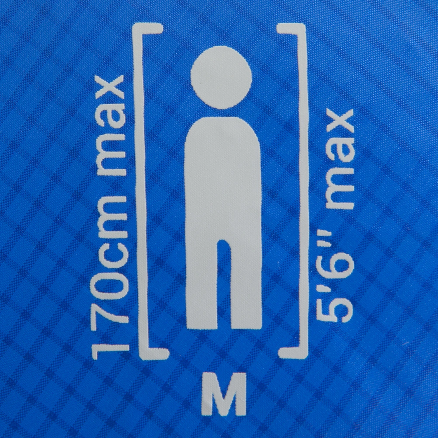 Mummy shape: Shoulder width (80 cm in size L) and tapers down towards feet with room to move but prevent heat loss at feet (20 cm in size L).